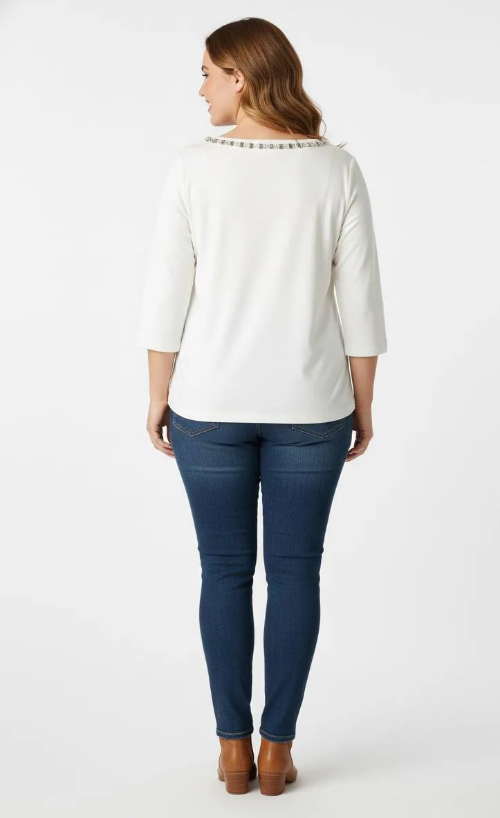 Blusa marca Old Navy en clásico color blanco, realzada con un detalle de pedrería en el cuello que aporta un toque sofisticado y femenino sin perder comodidad. Es una prenda ideal para elevar looks simples y darles un aire más elegante.