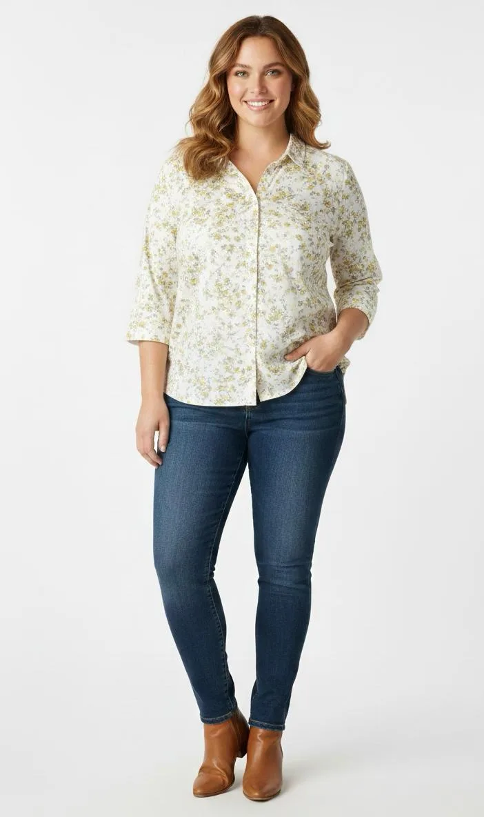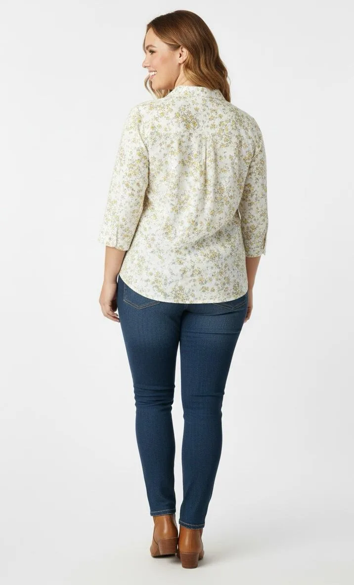 Blusa marca Basic Editions Woman en color blanco, con un delicado estampado floral en tonos amarillos y grises que aporta frescura y luminosidad al look. Su diseño es cómodo y versátil, ideal para el día a día.