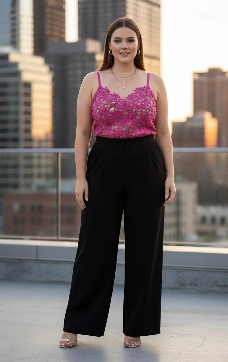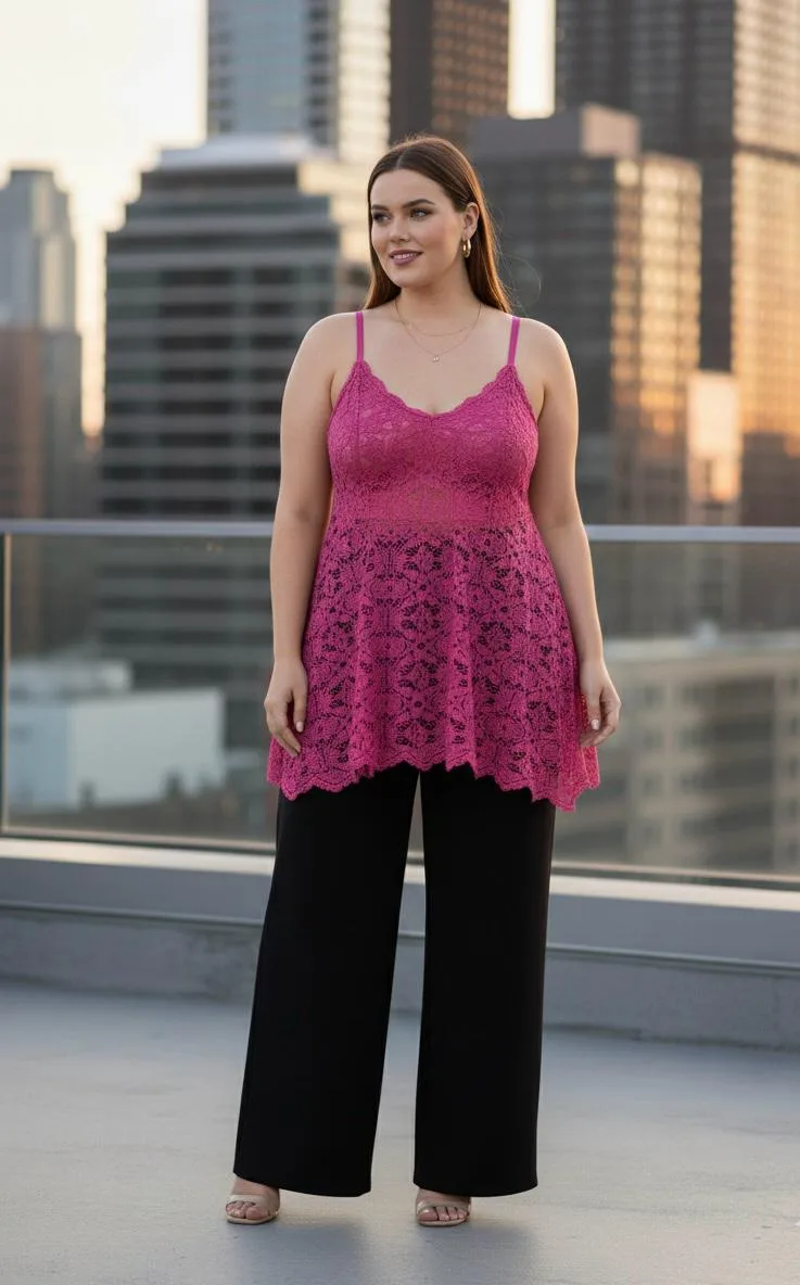 Blusa fucsia para mujer de la marca City Chic, confeccionada en delicado encaje tejido con forro interior, que entrega un acabado elegante y femenino. Su diseño permite un calce cómodo y favorecedor, acompañando la silueta sin transparencias.