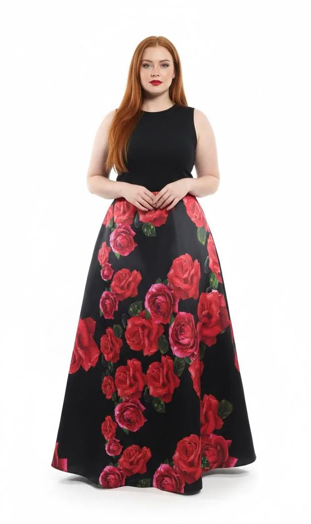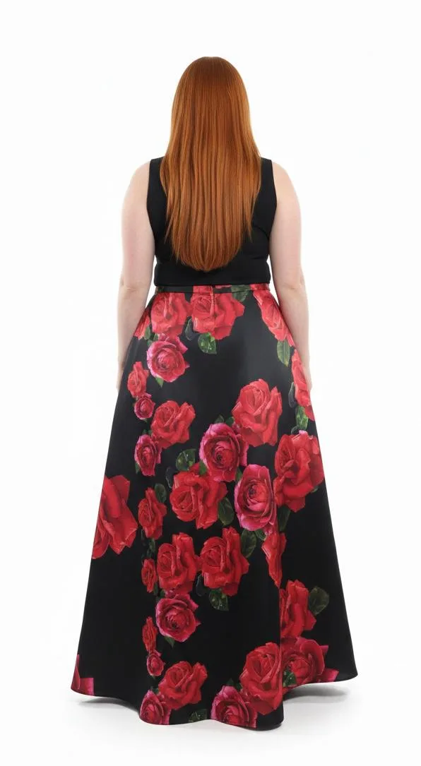 Falda larga mujer B. Darlin en color negro con elegante print de rosas rojas, confeccionada en tela gruesa y rígida, ideal para quienes buscan una prenda con estructura, caída firme y presencia. Su diseño largo estiliza la silueta y entrega un look sofisticado y femenino.