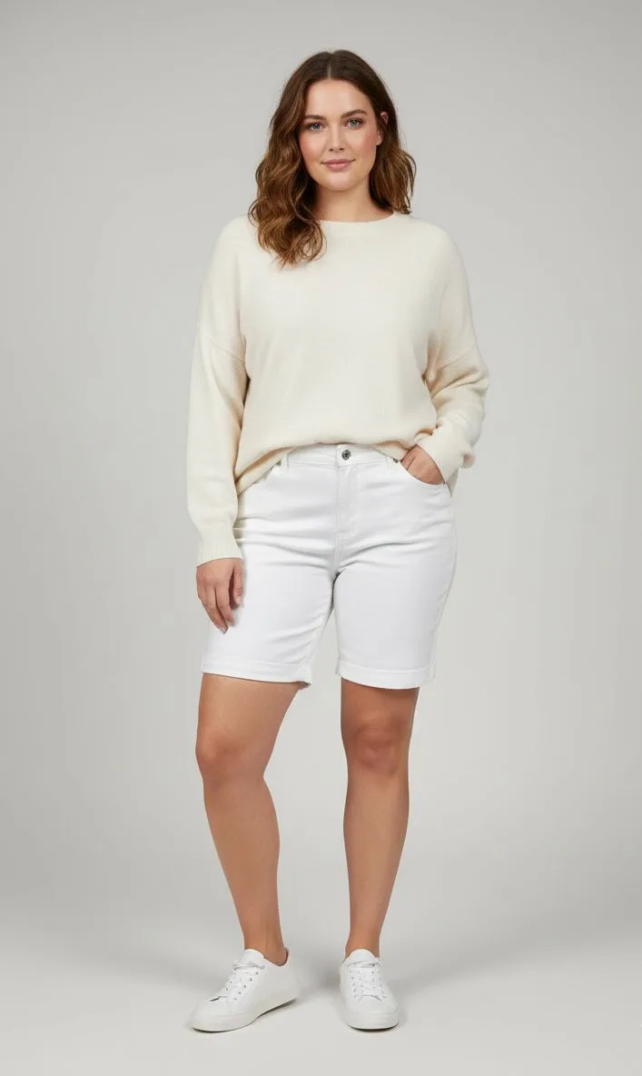 Su diseño clásico tipo bermuda lo hace extremadamente versátil: perfecto para combinar con poleras, blusas, tops o camisas, tanto para un look casual diario como para salidas más relajadas. El color blanco aporta frescura y estilo, ideal para primavera y verano.